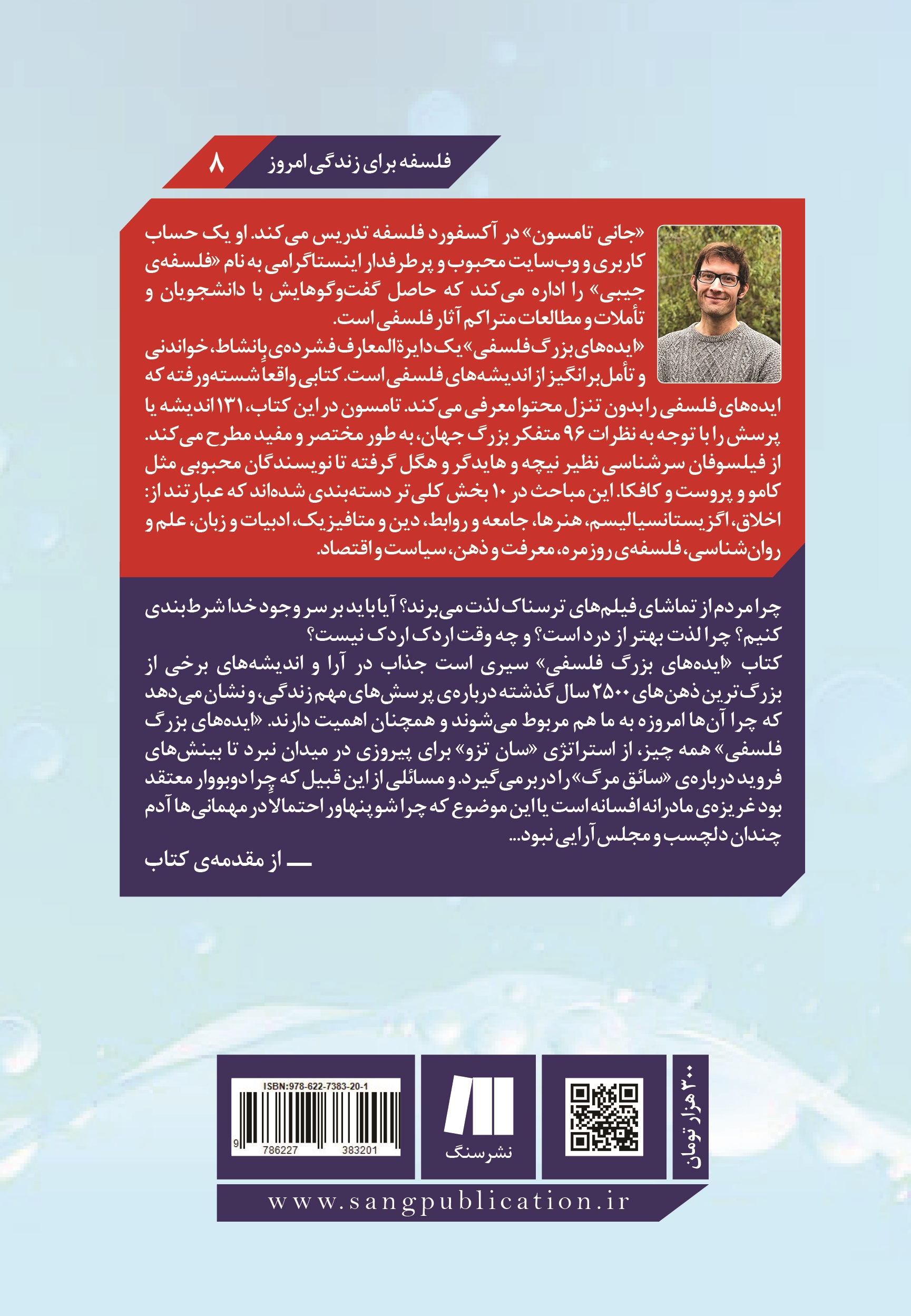 کتاب «ایده‌های بزرگ فلسفی»‌ سیری است جذاب در آرا و اندیشه‌های برخی از بزرگ‌ترین ذهن‌های ۲۵۰۰ سال گذشته درباره‌ی پرسش‌های مهم زندگی، و نشان می‌دهد که چرا آن‌ها امروزه به ما هم مربوط می‌شوند و همچنان اهمیت دارند. «ایده‌های بزرگ فلسفی» همه چیز، از استراتژی «سان تزو» برای پیروزی در میدان نبرد تا بینش‌های فروید درباره‌ی «سائق مرگ» را دربرمی‌گیرد. و مسائلی از این قبیل که چرا دوبووار معتقد بود غریزه‌ی مادرانه افسانه است یا این موضوع که چرا شوپنهاور احتمالاً در مهمانی‌ها آدم چندان دلچسب و مجلس‌آرایی نبود…