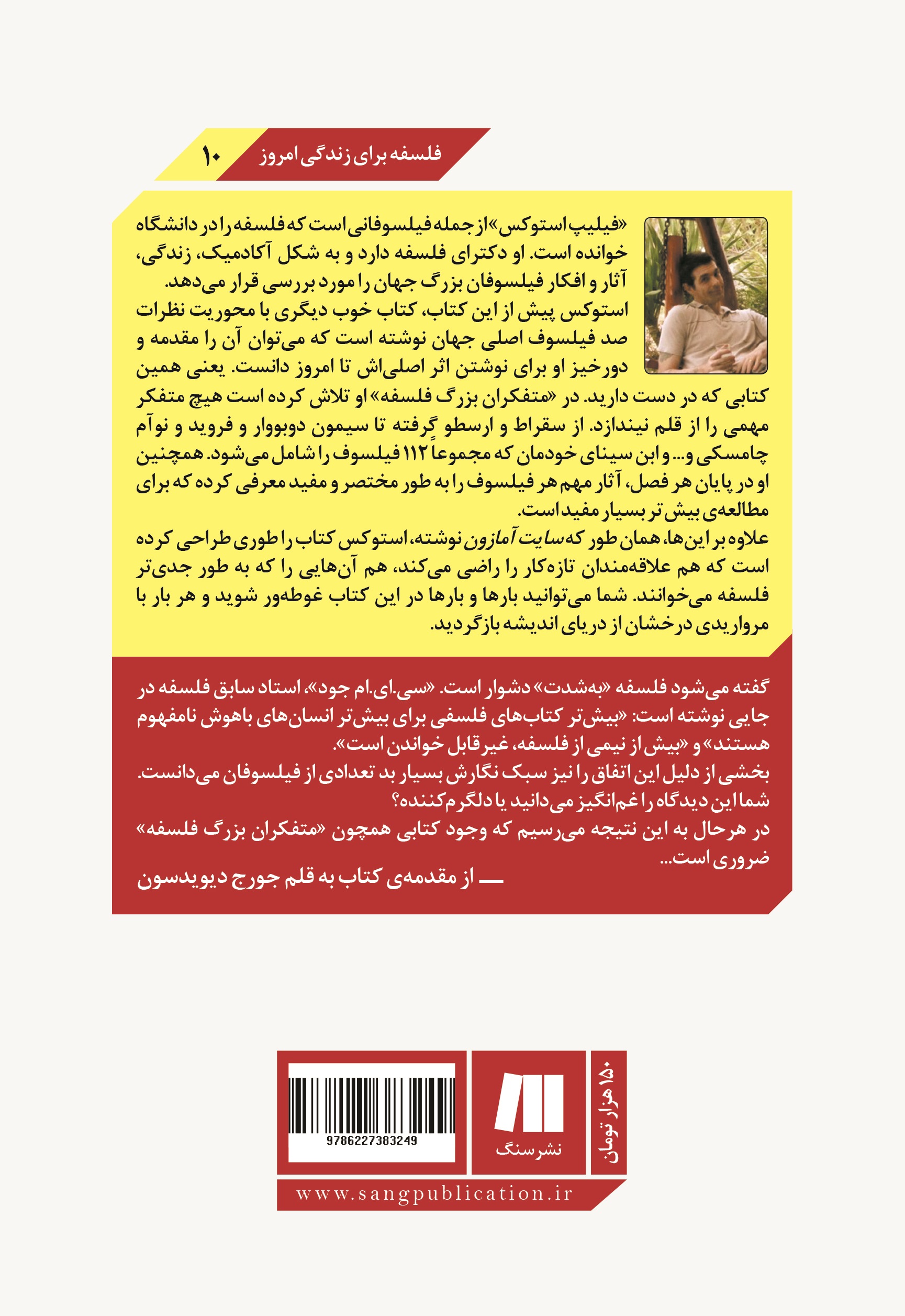 استوکس پیش از این کتاب، کتاب خوب دیگری با محوریت نظرات صد فیلسوف اصلی جهان نوشته است که می‌توان آن را مقدمه و دورخیز او برای نوشتن اثر اصلی‌اش تا امروز دانست. یعنی همین کتابی که در دست دارید. در «متفکران بزرگ فلسفه» او تلاش کرده است هیچ متفکر مهمی را از قلم نیندازد. از سقراط و ارسطو گرفته تا سیمون دوبووار و فروید و نوآم چامسکی و… و ابن سینای خودمان که مجموعاً ۱۱۲ فیلسوف را شامل می‌شود. همچنین او در پایان هر فصل، آثار مهم هر فیلسوف را به طور مختصر و مفید معرفی کرده که برای مطالعه‌ی بیش‌تر بسیار مفید است.