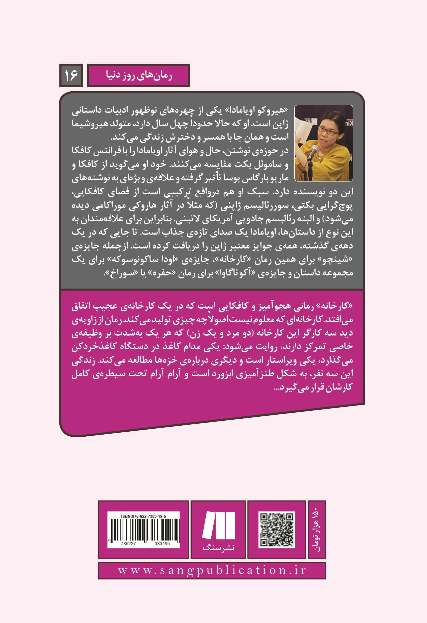 «کارخانه» رمانی هجوآمیز و کافکایی است که در یک کارخانهی عجیب اتفاق میافتد. کارخانهای که معلوم نیست اصولاً چه چیزی تولید میکند. رمان از زاویهی دید سه کارگر این کارخانه (دو مرد و یک زن) که هر یک بهشدت بر وظیفهی خاصی تمرکز دارند، روایت میشود: یکی مدام کاغذ در دستگاه کاغذخردکن میگذارد، یکی ویراستار است و دیگری دربارهی خزهها مطالعه میکند. زندگی این سه نفر، به شکل طنزآمیزی ابزورد است و آرام آرام تحت سیطرهی کامل کارشان قرار میگیرد…